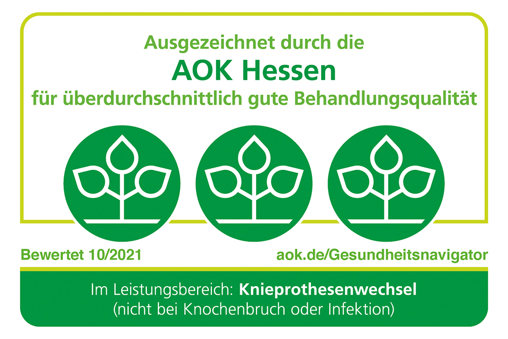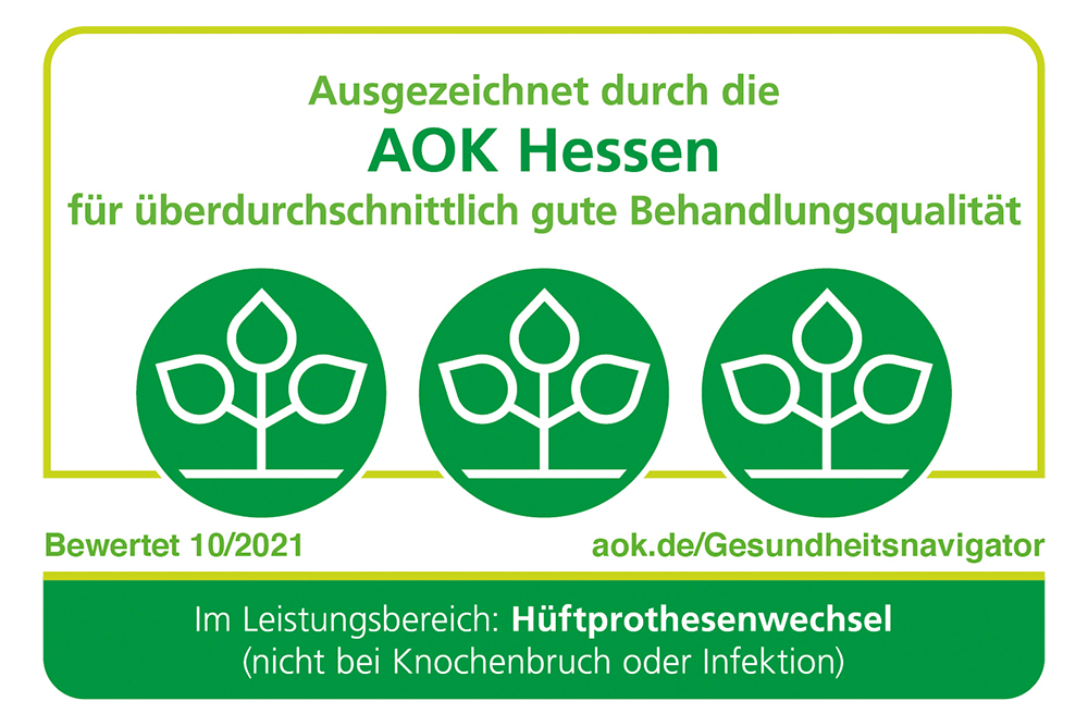 Als 1. Hessisches Zentrum für Wechselendoprothetik sind wir durch die langjährige Erfahrung unseres Personals und die Vorhaltung spezieller Implantate optimal aufgestellt. Dazu gehören klare diagnostische und therapeutische Standards, passgenaue Wechselkonzepte und maßgefertigte Wechselprothesen. Bestätigt wird die hervorragende Qualität durch die Auszeichnung der drei AOK-Bäumchen in den Bereichen „Hüftprothesenwechsel“ und „Knieprothesenwechsel“.